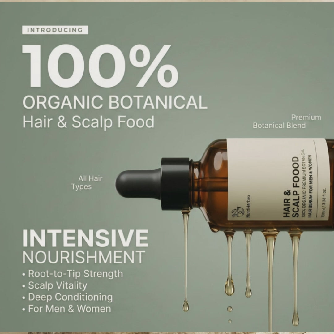 Hair & Scalp Food is a premium oil-based botanical serum designed to deeply nourish the scalp, strengthen hair follicles, repair damage, and promote healthier, fuller hair growth.