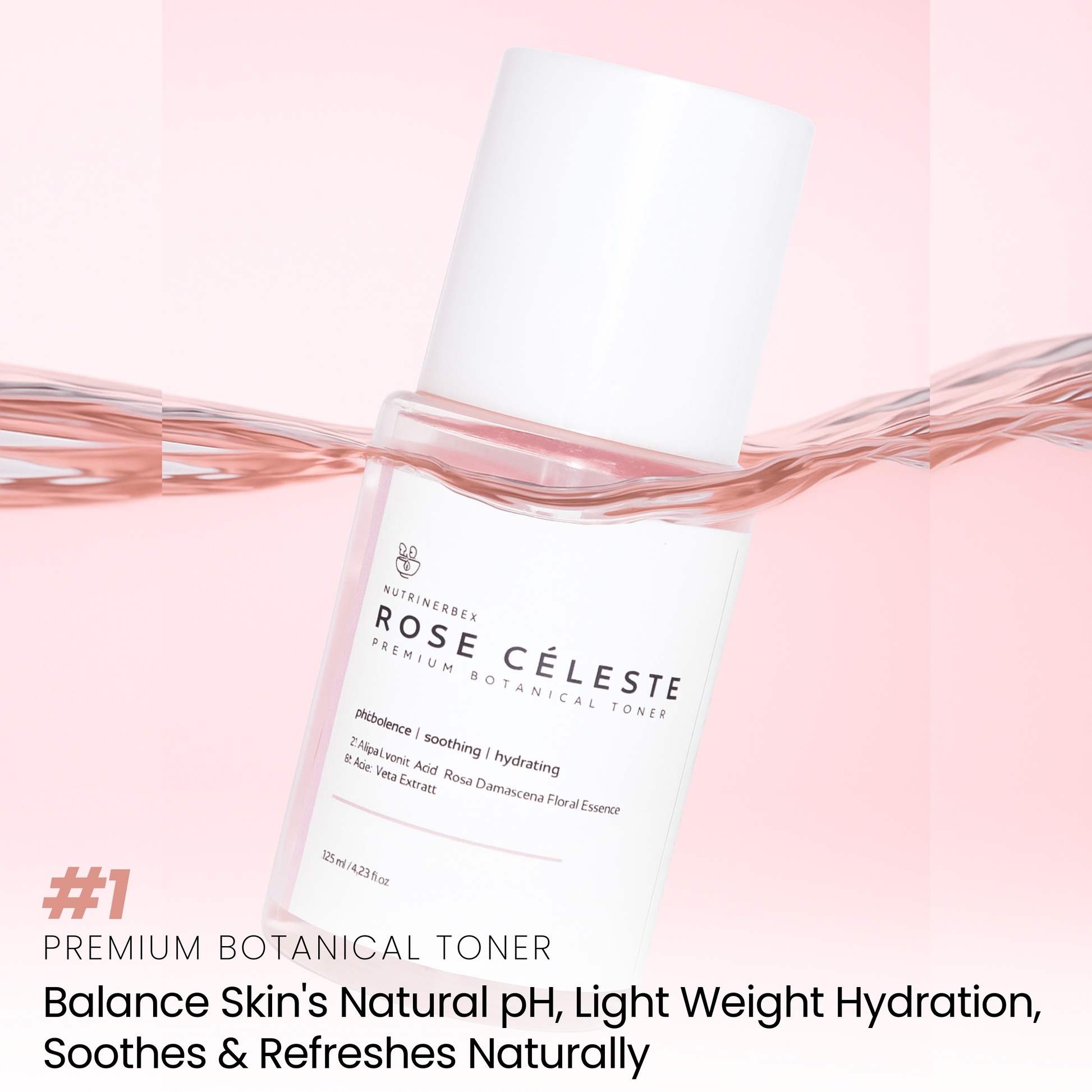 ROSE CÉLESTE by NutriHerbex is a premium botanical toner crafted with steam-distilled Rosa Damascena hydrosol, 2% Hyaluronic Acid solution, and soothing aloe vera extract — blended to refresh, plump, and hydrate your skin with every drop.