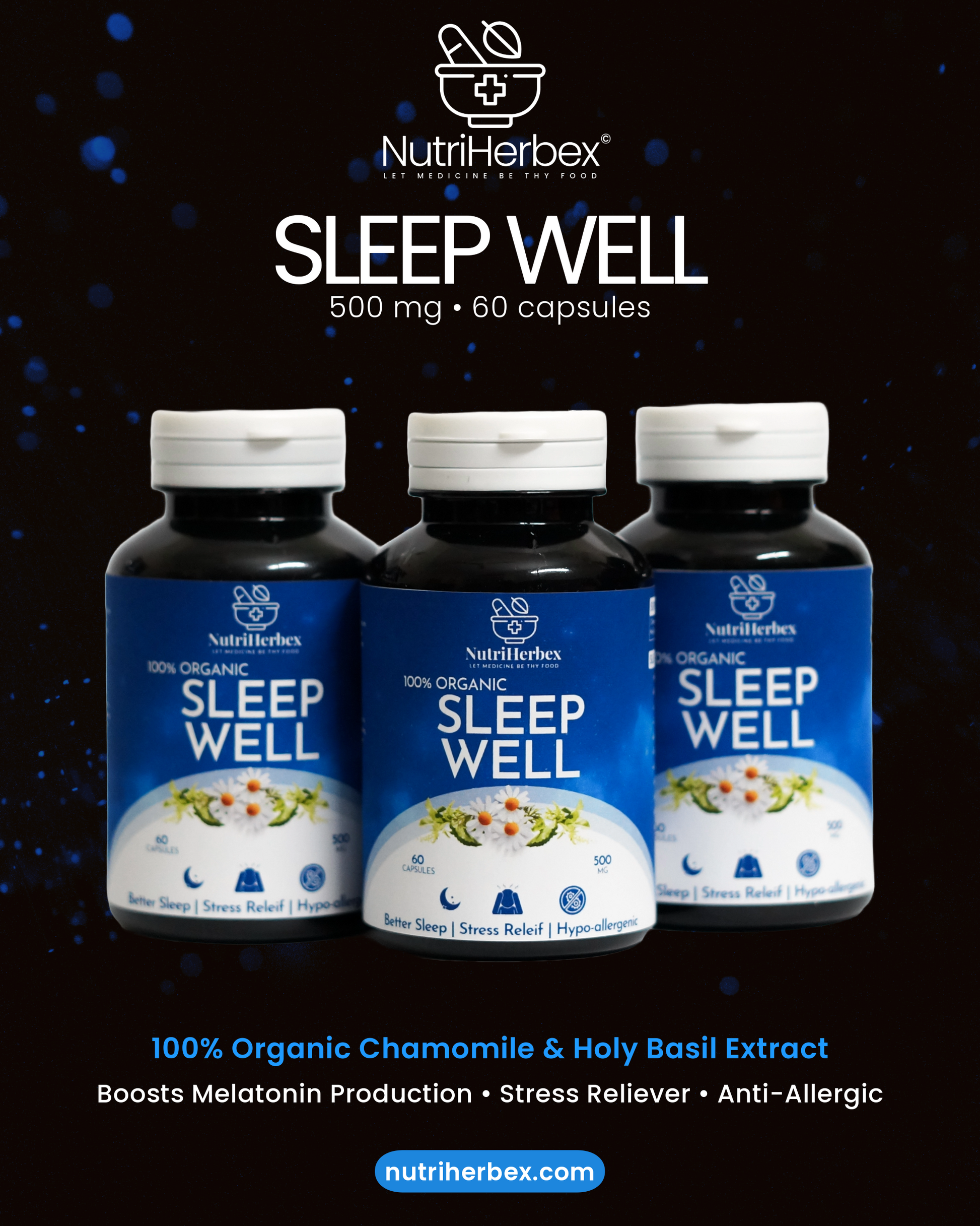 Unlock the boundless benefits of our 100% organic potent herbal blend. Promote sleep, boost natural melatonin, relieve stress, anxiety & depression; and is a natural anti-allergen - get countless other benefits with our 100% organic Sleep Well capsules.